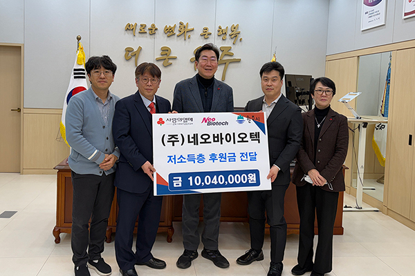 네오바이오텍, 기업과 임직원이 함께 만드는 나눔 문화…지역사회 상생 확대㈜네오바이오텍(대표 허영구, 이하 네오)이 지난 20일 원주시청을 방문해 관내 저소득 취약계층을 위한 후원금을 전달하며 지역사회 나눔 실천에 앞장섰다.이번 후원금은 네오 임직원들이 자발적으로 참여한 ‘1004 캠페인’을 통해 마련됐다. 이날 전달식에는 원강수 원주시장과 네오 관계자들이 참석했으며, 기탁된 성금은 원주시 복지정책과를 통해 저소득층 지원 사업에 사용될 예정이다.‘1004 캠페인’은 네오 임직원들이 매월 1,004원씩 모은 금액에 회사가 추가 지원금을 더해, 도움의 손길이 필요한 이웃에게 희망을 전하는 네오의 대표 사회공헌 활동이다. 2012년부터 시작된 이 캠페인은 기업과 임직원이 함께 만들어가는 네오만의 나눔 문화로 자리 잡았다. 특히 2021년 원주 기업도시로 이전한 이후에는 원주 지역 소외계층을 위한 지원을 꾸준히 이어오고 있으며, 지난해에는 원주시 아동·청소년 교육문화프로그램에 지정기탁한 바 있다.네오 관계자는 “임직원 500여 명의 정성이 담긴 이번 후원금에는 지역사회와 상생하겠다는 네오의 의지가 담겨 있다”며, “앞으로도 관내 취약계층을 위한 나눔 활동을 지속하며 지역사회에 책임을 다할 것”이라고 말했다.한편 네오는 매년 기부행사를 통해 지역사회와 상생하는 기업으로서의 역할을 이어가고 있다. 최근에는 장애인 스포츠단 후원을 비롯해 장애인 시설 유니트체어 기부, 대학생 장학금 전달, 원주시 장애인예술단 창단, 노사상생일자리 협약 체결 등 다양한 사회공헌 활동을 전개하며 지속 가능한 나눔의 경영철학을 실천하고 있다. 출처 : 덴탈뉴스(https://www.dentalnews1.com)